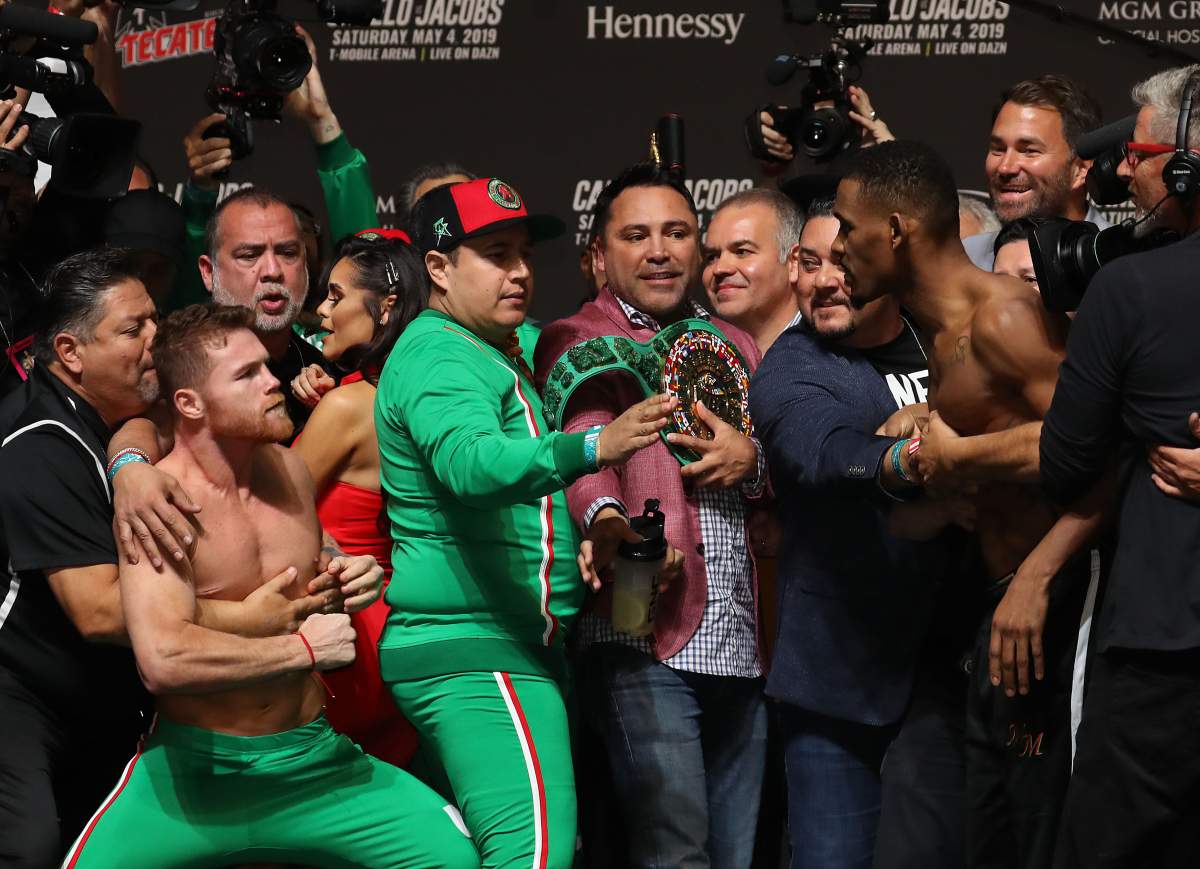 El mexicano y el neoyorquino se vieron las caras hace unos minutos, durante la ceremonia de pesaje, y aunque es bien sabido que en este tipo de eventos siempre prima el show como una manera de atraer más publicidad al combate, Canelo y Jacobs se fueron a los golpes. Los peleadores arribaron a la tarima en medio de rancheras y canciones de hip hop, y luego se agredieron.