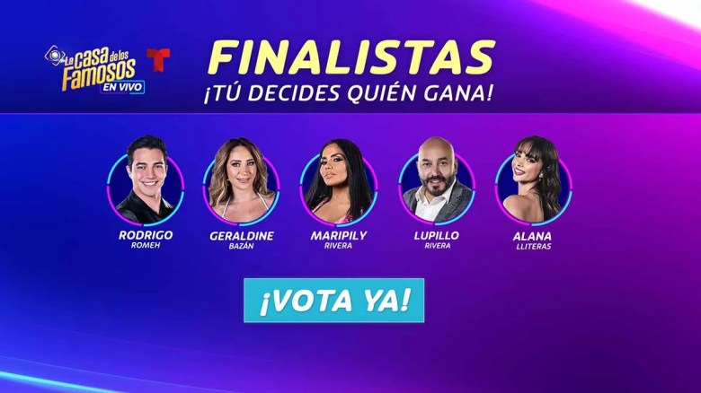 La Gran Final de La Casa de los Famosos se celebra este lunes 20 de mayo. Los habitantes que sobrevivieron 119 días fueron Lupillo Rivera, Maripily Rivera, Alana Lliteras, Rodrigo Romeh y Geraldine Bazán, quien llegó a la mitad de la cuarta temporada.