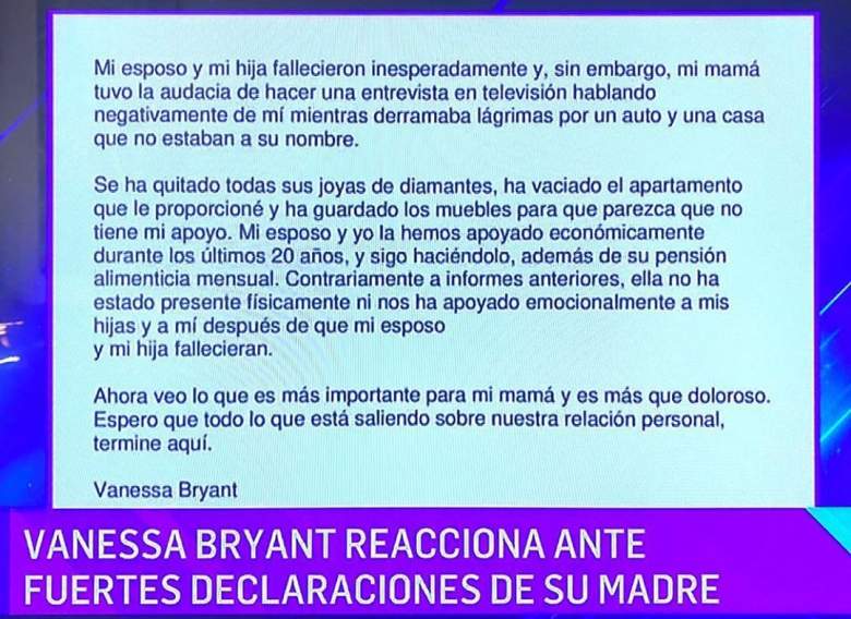 Según el programa de la cadena Univision, Vanessa Bryant respondió a las acusaciones de su mamá con un texto en el que dice que su mamá escondió joyas y muebles en la entrevista para pretender que su situación es peor que la que es.