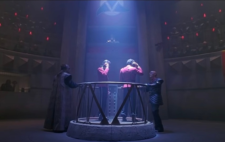 Para crear sus caras Klingon, Stillwell y Ganino tenían máscaras de goma que Stillwell describió como ” realmente horrible.” Por lo general, Klingons no llevaba una máscara completa para el papel. En su lugar, llevaban una prótesis de frente y habían aplicado maquillaje elaborado. Sin embargo, ya que la escena del tribunal tenía más klingons en ella que cualquier anterior Star Trek escena, no había tiempo para dar cada extra el tratamiento de maquillaje completo. Así que los extras tienen máscaras “hidientes”. Stillwell entró en gran detalle sobre lo incómodos que eran los extras de Klingon durante el rodaje.
