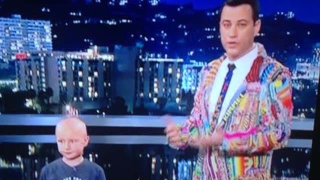 En el programa de anoche, él orgullosamente donó el traje de loom colorido. También leyó en voz alta las cartas de niños que fueron enviadas. Uno vino como una entrada de video y le pidió a Kimmel su ayuda.
