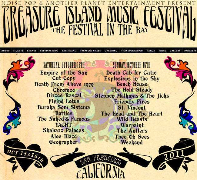 Situado en la hermosa Bahía de San Francisco, el Festival de Música de la Isla del Tesoro celebra su quinto cumpleaños este año, y la alineación parece ser sólida. Empire of the Sun titulares on Sábado and Death Cab For Cutie on Sunday, with Cut Copy, Death From Above 1979, Flying Lotus, Dizee Rascal, Chromeo, YACHT, Shabazz Palaces, St. VIncent, Warpaint, The Antlers, Thee Oh Sees, Friendly Fires, Explosions In The Sky, Beach House (uno de sus pocas actuaciones en vivo en 2011), y un montón de factura Las entradas ya están en venta para el evento 15 y 16 de octubre. Cabeza aquí para todos los destiles.