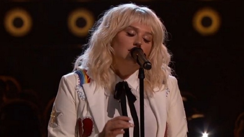 Doning bangs y un traje blanco con parches coloridos, Kesha llevó a cabo un rendimiento emocional pero simple.