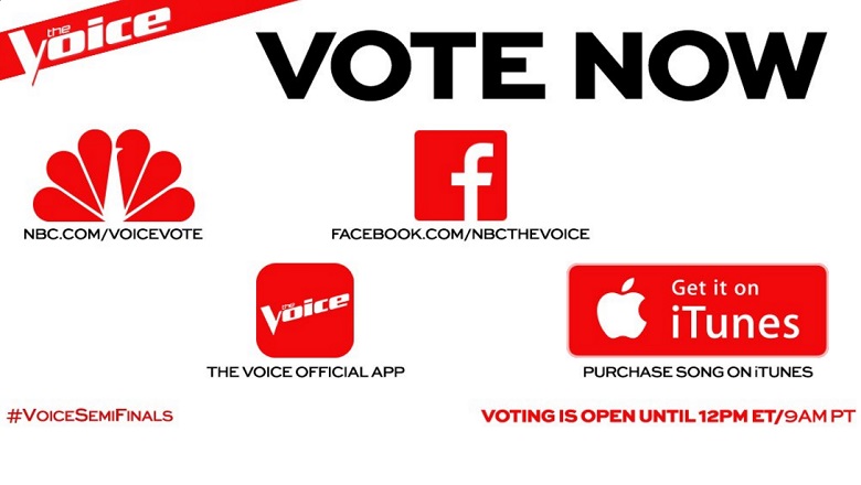 Para votar usando The Voice App haga clic aquí para descargarlo. El sitio le permite descargar la aplicación a través de Google Play, la tienda de Windows Phone y la tienda de Apple. Durante los shows en vivo, puede empezar a votar tan pronto como comience el espectáculo. Y, en las noches de resultados, puede instantáneamente salvar a sus concursantes favoritos con un “tap-to-tweet” directamente de la aplicación. De nuevo, el límite es 10 votos por concursante y por dirección de correo electrónico. Votando en iTunes